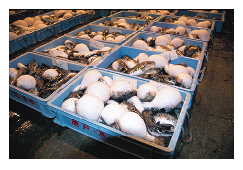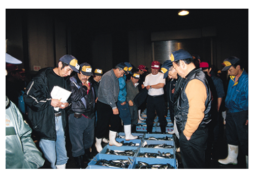 南風泊のふくセリは「袋セリ」と言われ、セリ人と業者が布袋に手を入れ、指先で値段を決めるという特徴的なセリが行われています。